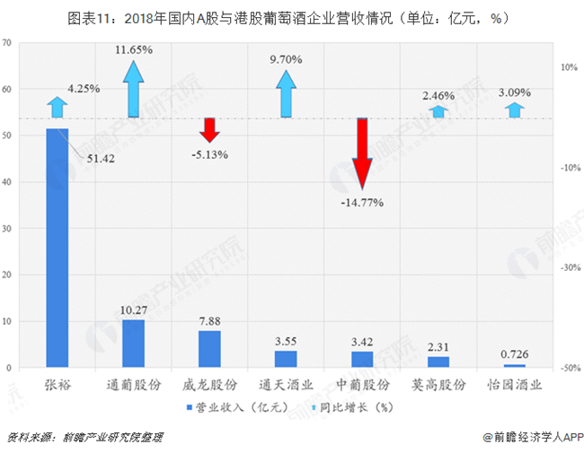 2018年七家葡萄酒企業(yè)的營(yíng)業(yè)收入總和達(dá)到近80億元,其中只有威龍股份和中葡股份兩家企業(yè)營(yíng)收出現(xiàn)下跌。張?jiān)T?018年實(shí)現(xiàn)營(yíng)收51.42億元,同比增長(zhǎng)4.25%,行業(yè)龍頭位置穩(wěn)固;通葡股份營(yíng)收增速最高,達(dá)11.65%,營(yíng)收10.27億元達(dá)到上市以來新高;中葡股份下滑幅度最大,2018年?duì)I收實(shí)現(xiàn)3.42億元,同比下滑14.77%,連續(xù)兩年虧損的中葡股份股票實(shí)施退市風(fēng)險(xiǎn),股票簡(jiǎn)稱由“中葡股份”變?yōu)?ldquo;*ST中葡”。
