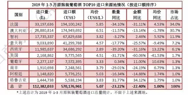 近日,中國(guó)食品土畜進(jìn)出口商會(huì)酒類進(jìn)出口商分會(huì)發(fā)布2019年一季度酒類進(jìn)口統(tǒng)計(jì)報(bào)告。報(bào)告顯示,一季度,進(jìn)口酒類市場(chǎng)整體呈下行態(tài)勢(shì),且降幅仍在擴(kuò)大。其中,葡萄酒進(jìn)口延續(xù)跌勢(shì),量額跌幅均逾兩成。進(jìn)口量1.5億升,進(jìn)口額6.2億美元,約占酒類進(jìn)口總額的55.4%。
