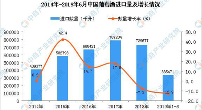 中商情報網(wǎng)訊:據(jù)中商產(chǎn)業(yè)研究院數(shù)據(jù)庫顯示,2019年1-2季度中國葡萄酒進(jìn)口量逐漸增長,增長11.58%。2019年1-6月中國葡萄酒進(jìn)口量為335471千升,同比下降12.9%。
