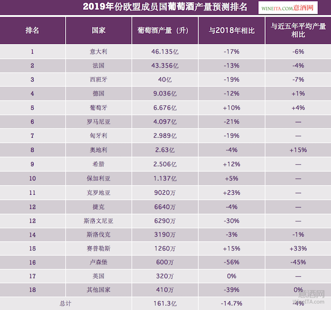 2019年預(yù)估葡萄酒產(chǎn)量排名前十的國(guó)家還有羅馬尼亞(4.097億升)、匈牙利(2.989億升)、奧地利(2.63億升)、希臘(2.506億升)和保加利亞(1.137億升)。