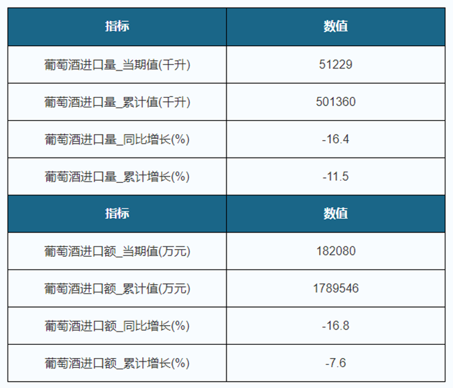 2019年9月我國(guó)葡萄酒進(jìn)口量為51229千升,同比下降16.4%,進(jìn)口金額為182080萬元,同比下降16.8%;1-9月進(jìn)口量為501360千升,累計(jì)下降11.5%,進(jìn)口金額為1789546萬元,累計(jì)下降7.6%。