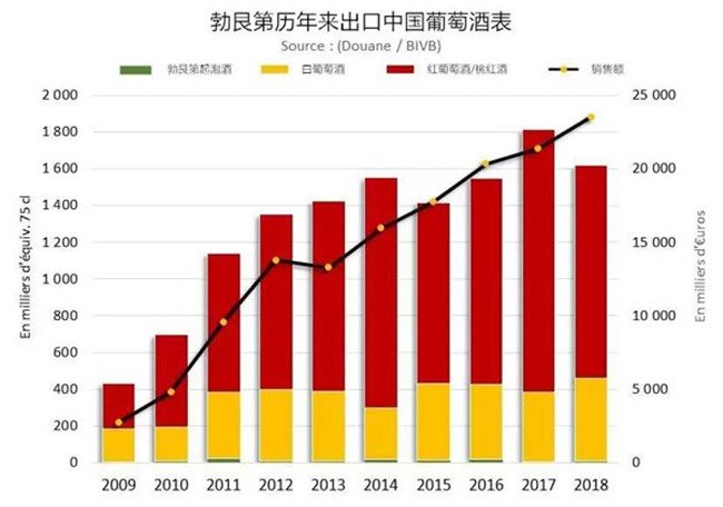 2018年勃艮第出口了1600萬(wàn)瓶葡萄酒到中國(guó)大陸,這個(gè)數(shù)量比2017年同期降低了10.6%,但出口價(jià)值達(dá)到了2350萬(wàn)歐元,比2017年同期上漲了9.9%。