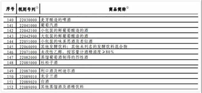 葡萄酒在內(nèi)的酒類商品作為美國重要的農(nóng)產(chǎn)品,就包含在《國務(wù)院關(guān)稅稅則委員會關(guān)于對原產(chǎn)于美國的部分進(jìn)口商品(第 3 批)加征關(guān)稅的公告》(稅委會公告〔2019〕4 號)附件 2 第 1 部分商品內(nèi),因此可以免予在此前基礎(chǔ)上加征的 10% 關(guān)稅。具體包含內(nèi)容如下: