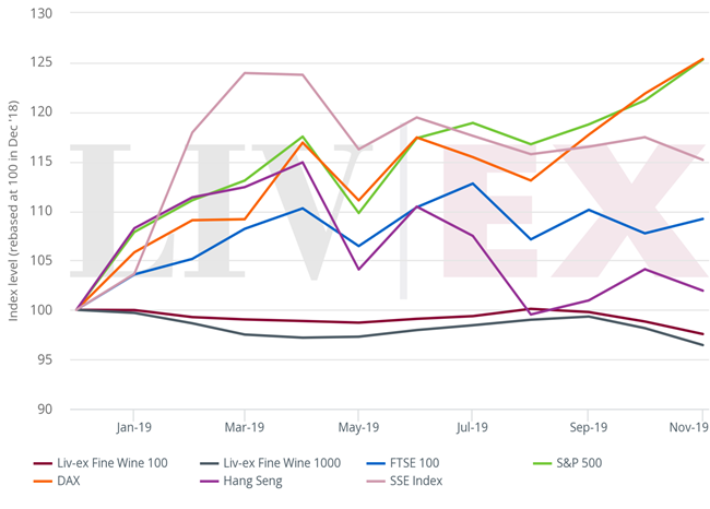 為了更好地反映優(yōu)質(zhì)葡萄酒的表現(xiàn)情況,下圖將Liv-ex 100和Liv-ex 1000與全球股票進行比較。盡管優(yōu)質(zhì)葡萄酒指數(shù)相對穩(wěn)定,但由于利率下調(diào)提高了投資者承受風(fēng)險的意愿,使其表現(xiàn)仍遠遠落后于全球股市。恒生指數(shù)一向表現(xiàn)平平的香港,成為了優(yōu)質(zhì)葡萄酒需求的主要來源。 事實上,自春季以來,該指數(shù)和上證綜合指數(shù)一直下跌。