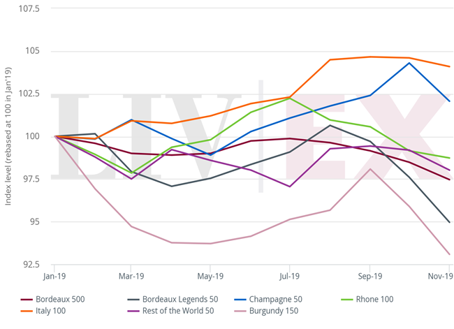 在所有分項指數(shù)中,只有香檳50和意大利100在2019年度出現(xiàn)正增長,分別上升2.2%和4.6%。在過去一年,由于這兩酒區(qū)的悠久歷史和品牌力量,以及一系列的出色年份和相對較低入市價格,日漸受酒評家和市場的高度關(guān)注,令它們交易增加和價格上升,表現(xiàn)勝于勃艮第和波爾多。事實上,香檳和意大利仍未包括在美國最近的新關(guān)稅葡萄酒之列,因而進一步受惠。