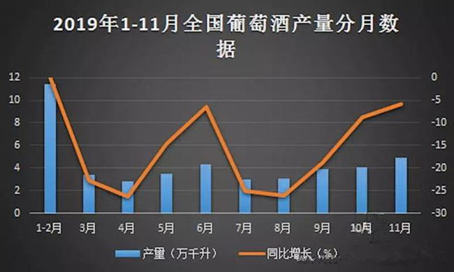 一方面是昂揚向上的精神勁頭,另一方面全國葡萄酒產(chǎn)量數(shù)據(jù)卻為其潑了一盆冷水。根據(jù)中國報告大廳對2019年1-11月全國葡萄酒產(chǎn)量進行監(jiān)測統(tǒng)計顯示:2019年11月全國葡萄酒產(chǎn)量4.9萬千升,同比下降5.8%,2019年1-11月全國葡萄酒產(chǎn)量為37.2萬千升,累計下降12.1%。
