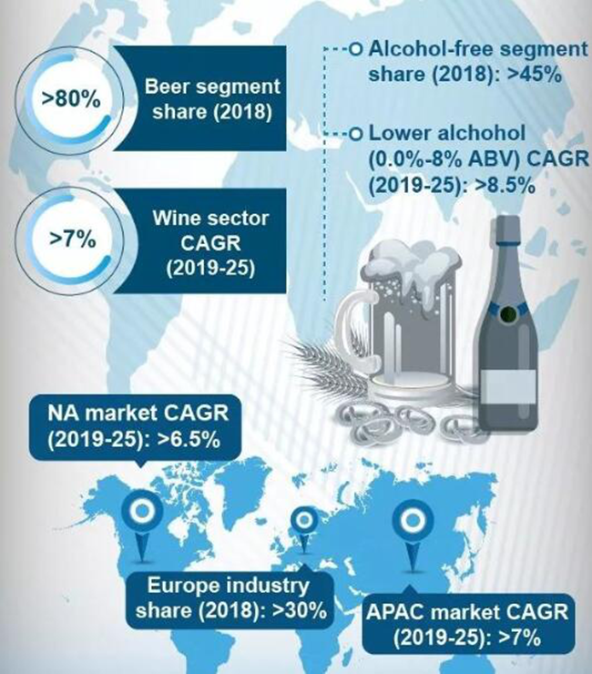 根據(jù)全球市場(chǎng)洞察(Global Market Insights)2019年發(fā)布的報(bào)告,2018年無(wú)醇葡萄酒和無(wú)醇啤酒市場(chǎng)規(guī)模為200億美元,預(yù)計(jì)從2019年到2025年,年復(fù)合增長(zhǎng)率將超過(guò)7%,達(dá)300億美元,以下是部分?jǐn)?shù)據(jù):