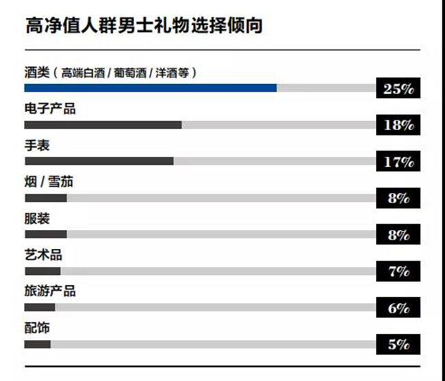 25%的高凈值男士喜歡選擇酒類作為禮物進(jìn)行贈送。這種現(xiàn)象也反映在收藏領(lǐng)域。