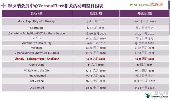 當(dāng)?shù)貢r(shí)間3月23日晚,意大利維羅納會(huì)展公司(Veronafiere)正式宣布,原計(jì)劃于2020年6月舉行的第54屆VinItaly將延期至2021年4月18至21日在維羅納(Verona)舉行。Opera Wine也將隨之延期至2021年4月17日舉行。這是VinItaly歷史上首次延期舉辦。