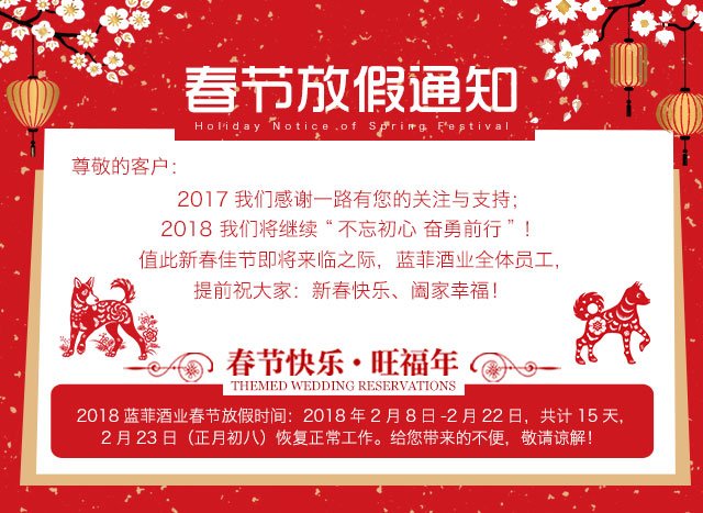新年的鐘聲即將敲響,根據(jù)國家春節(jié)假期通知及藍菲公司的實際情況,確定于2018年2月9日-2月22日,共14天,為藍菲酒業(yè)春節(jié)假期,于2018年2月23日(正月初八)正式上班,請好朋友們悉知。同時在此提前恭祝,新春快樂!