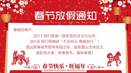 尊敬的藍(lán)菲代理商朋友們: 新年的鐘聲即將敲響,根據(jù)國家春節(jié)假期通知及藍(lán)菲公司的實(shí)際情況, 確定于2018年2月9日-2月22日,共14天,為藍(lán)菲酒業(yè)春節(jié)假期,于2018年2月23日(正月初八)正式上班,請好朋友們悉知。 同時(shí)在此提前恭祝,新春快樂! 2017年是非同尋...