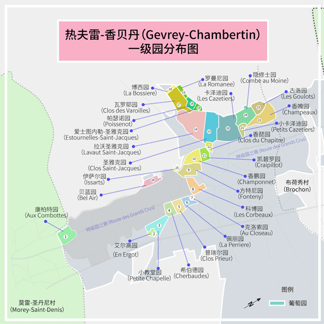此外,勃艮第還有數(shù)個大大小小的村莊,不同村莊衍生出了不同的法定產(chǎn)區(qū),各個村莊獨特的風(fēng)土也為這些村莊刻上不同標(biāo)簽。比如,提到熱夫雷-香貝丹(Gevrey-Chambertin),就會讓人想到強(qiáng)勁、飽滿、豐富和堅實的結(jié)構(gòu),以及極強(qiáng)的陳年能力。提到香波-慕西尼(Chambolle-Musigny)就讓人想到優(yōu)雅與精致。