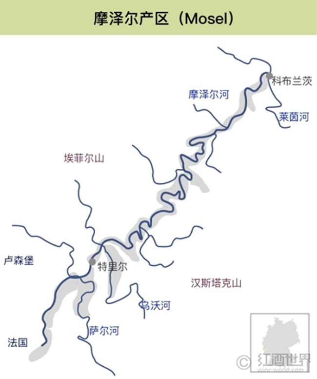 摩澤爾產(chǎn)區(qū)是德國(guó)13個(gè)法定葡萄酒產(chǎn)區(qū)之一,其產(chǎn)量在德國(guó)排名第三,不過(guò),由于摩澤爾享譽(yù)國(guó)際的名聲,常常有人將其視為產(chǎn)區(qū)中的領(lǐng)頭者。摩澤爾產(chǎn)區(qū)包括摩澤爾河(Mosel River)及其支流薩爾河(Saar River)和烏沃河(Ruwer River)的河谷地區(qū),其名字也來(lái)源于摩澤爾河。實(shí)際上,在2007年8月1日之前,該產(chǎn)區(qū)名字為摩澤爾-薩爾-烏沃(Mosel-Saar-Ruwer),后來(lái)為了便于記憶而簡(jiǎn)化為了摩澤爾。
