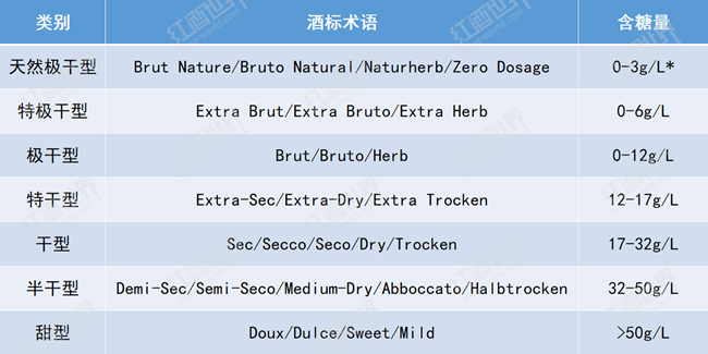與靜止酒不同,起泡酒根據(jù)糖分含量對葡萄酒的劃分更為細致,含糖量由低到高可分為天然極干型、特極干型、極干型、特干型、干型、半干型和甜型七個類型。在使用傳統(tǒng)法(Traditional Method)、轉移法(Transfer Method)或罐中發(fā)酵法(Tank Method)釀造起泡酒時,酒液在最終封瓶或裝瓶前,都會使用由酒液和糖組成的調味液(Liqueur d'Expedition)進行補液,調味液中的糖分含量便決定了最終成酒的含糖量,而天然極干型起泡酒在補液時不允許添加糖分,因此最終成酒糖分含量僅在0-3g/L之間。阿斯蒂起泡酒的糖分含量則由酒精發(fā)酵終止時酒中的殘?zhí)橇繘Q定。