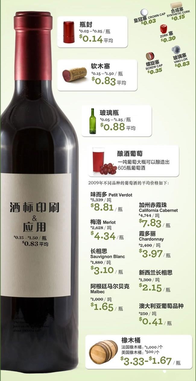 葡萄酒釀出來之后,在到達消費者手中之前,還必須經(jīng)過包裝、運輸和分銷等過程。葡萄酒的包裝費用包括酒瓶、瓶塞、瓶封、酒標和箱子等。不同的瓶塞價格各不相同,比如軟木塞的平均費用是0.83美元/個,而螺旋塞的費用要低不少,只要0.35美元/個。一個玻璃酒瓶需要0.88美元左右……不同的生產(chǎn)商可能采用不同的方式把自己的葡萄酒推上市場,不過,不管選用哪種方式,都需要支付一定的分銷成本。