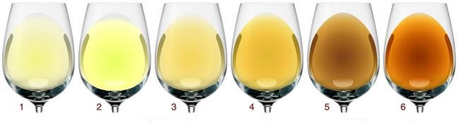 顏色并不能100%反映葡萄酒的甜度。但如果釀造的時候,大部分白葡萄酒的糖分以榨取葡萄皮而來,那葡萄酒的顏色便會更易顯見。例如法國波爾多蘇玳(Sauternes) 的甜葡萄酒主要以賽美容(Semillion)釀造,釀造過程會作短暫泡皮工序,所以一般顏色會偏向啡黃色,偏向附圖的(4)。相反例如麝香(Muscat) 或瓊瑤漿(Gewurztraminer)葡萄則不一定有明顯深啡色,較偏向為附圖(3)。