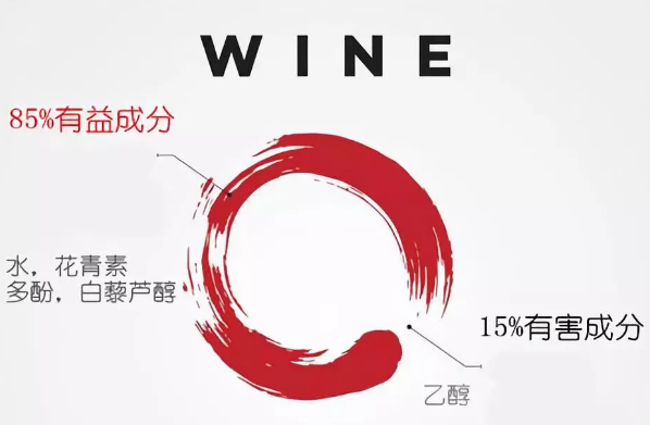 一杯酒中大部分是類似水,花青素和多酚(包括單寧和白藜蘆醇)之類,這些成分都是對身體有好處的。