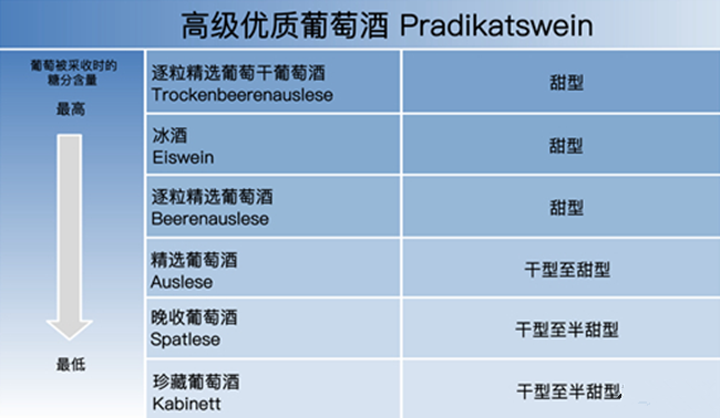 在德國,PDO葡萄酒的產(chǎn)量最大,而其中高級優(yōu)質(zhì)葡萄酒占有非常重要的地位。由于氣候寒冷,葡萄的成熟度對于德國葡萄酒來說至關(guān)重要,于是法律根據(jù)葡萄采收時(shí)的成熟度,又將高級優(yōu)質(zhì)葡萄酒細(xì)分為以下6個等級。別看它很復(fù)雜,但只要將這一分級看做葡萄酒的風(fēng)格劃分,理解起來就很容易了。