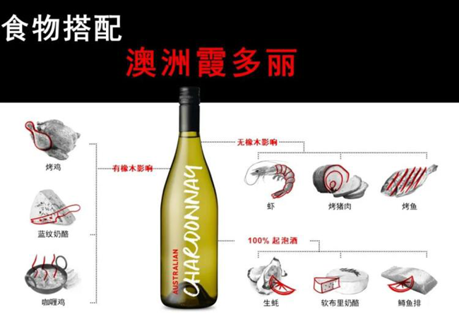 澳大利亞霞多麗的多種風(fēng)格使其成為市場(chǎng)上最易搭配食物的葡萄酒。豐潤(rùn)的質(zhì)感和高酸度的霞多麗可以和軟奶酪完美搭配。濃郁和有橡木影響的霞多麗風(fēng)格能夠搭配重口味的魚(yú)肉或禽類菜肴。未受橡木影響的清瘦型霞多麗和較淡和辛辣的菜肴,特別是海鮮和魚(yú)類,或奶油菜式非常相配,只要葡萄酒中含有足夠的酸度,就能夠分解奶油的肥膩感。