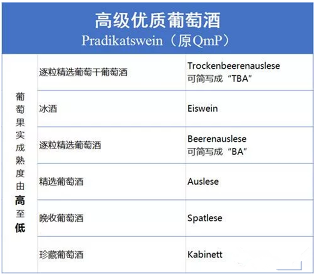 德國與歐洲其他國家最明顯的不同是對最高級別的葡萄酒又根據(jù)葡萄果實的成熟度進行了細分