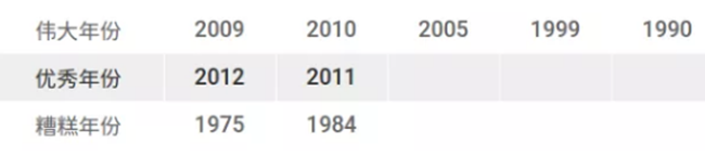 建議:如果想要一瓶馬上可以喝的品質(zhì)優(yōu)異的勃艮第的話,2009年份是很好的選擇。這一年的勃艮第普遍酸度較低,單寧成熟度較高,適合較早飲用。2010年份的夜丘也不錯,不過該年份產(chǎn)量較低,不太容易買到合理價位的酒。2011年份則表現(xiàn)不均勻。對于收藏家來說,2005年份仍然是首選,前提是你現(xiàn)在還能買得到!