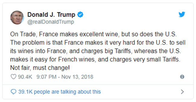 其實,川普盯上法國葡萄酒也不是頭一回了,之前就在推特上發(fā)文炮轟,痛斥法國在葡萄酒貿(mào)易上“霸道”,說的也是關(guān)稅的事。