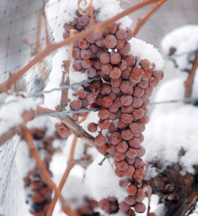 風干葡萄將“濃縮就是精華”奉為真理,冰葡萄則用冰霜鎖住精華。在寒冷地區(qū),種植者們會將葡萄留于枝頭,成串結(jié)冰,直至嚴冬在夜間進行采收。冰葡萄硬度大,壓榨時需要施加較大壓力,榨出來的葡萄原汁僅有正常收獲葡萄的五分之一,卻濃縮了很高的糖分、酸度和風味物質(zhì)。最終的成酒沒有風干葡萄酒那樣不加掩飾的奔放香氣與厚重酒體,而是以清潤甜美的風格自成一派。