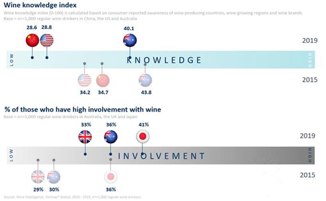 與此同時(shí),在2015年至2019年期間,中美兩國(guó)消費(fèi)者對(duì)葡萄酒的了解程度卻大幅下降。中國(guó)消費(fèi)者的葡萄酒知識(shí)指數(shù)下降6點(diǎn),從34.7降至28.6;而美國(guó)消費(fèi)者的葡萄酒知識(shí)指數(shù)同樣也下降了6點(diǎn),從34.2降至28.8。葡萄酒情報(bào)公司W(wǎng)ine Intelligence的“葡萄酒知識(shí)回顧指數(shù)”是根據(jù)消費(fèi)者對(duì)葡萄酒生產(chǎn)國(guó)、地區(qū)、品種和品牌的認(rèn)知度來(lái)計(jì)算的,以0到100的比例表示,分?jǐn)?shù)越高,知識(shí)就越多。