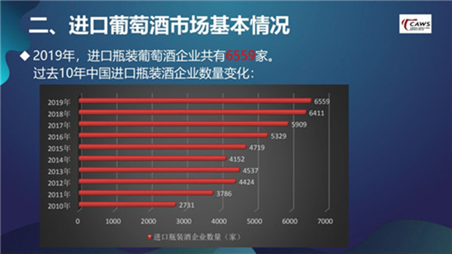進(jìn)口瓶裝葡萄酒企業(yè)數(shù)量不斷增加,中小企業(yè)面臨挑戰(zhàn)。 從過去10年的數(shù)據(jù)來看,中國進(jìn)口瓶裝葡萄酒企業(yè)數(shù)量整體上是不斷增加的。2019年也不例外,進(jìn)口瓶裝葡萄酒企業(yè)共有6559家,比2018年增加了148家。產(chǎn)生這種情況的原因,我認(rèn)為有兩個(gè),一是葡萄酒的商品屬性,決定了它經(jīng)營上的分散化;二是中國葡萄酒企業(yè)自身韌性十足,在市場大調(diào)整時(shí)期仍在堅(jiān)持。