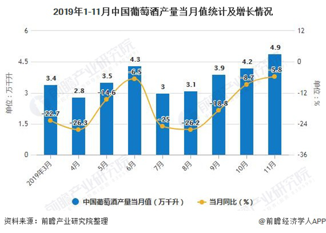 根據(jù)國家統(tǒng)計局?jǐn)?shù)據(jù)顯示,2018年全年中國葡萄酒產(chǎn)量達(dá)到了62.9萬千升,累計下降7.4%。截止至2019年11月中國葡萄酒產(chǎn)量為4.9萬千升,同比下降5.8%。累計方面,2019年1-11月中國葡萄酒產(chǎn)量達(dá)到37.2萬千升,累計下降12.1%。