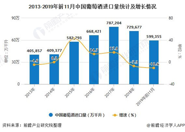 據(jù)中國海關(guān)總署數(shù)據(jù)顯示,2019年11月中國葡萄酒進(jìn)口量為53218千升,同比下降-4.7%。累計方面,2019年1-11月中國葡萄酒進(jìn)口量達(dá)到599355千升,同比下降10.6%。