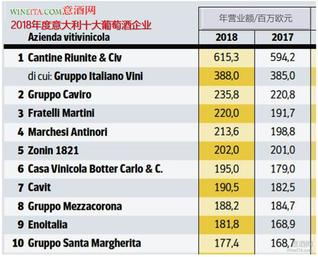 意大利雖然擁有超過10萬家酒莊,但是95%以上的酒莊年產(chǎn)量都在10萬瓶以下,即使是意大利排名前十大的企業(yè),除了GIV集團(tuán)年產(chǎn)值超過3億歐元,其余9家的產(chǎn)值都在2.5億歐元以內(nèi)。意大利的前十大公司經(jīng)營規(guī)模和綜合實(shí)力,與法國(拉菲羅斯柴爾德和卡思黛樂集團(tuán)年產(chǎn)值均超10億美元)、澳大利亞(2019年富邑20億美元產(chǎn)值)、智利(干露超過10億美元)、美國(嘉露超過30億美元)的大型酒業(yè)集團(tuán)規(guī)模差距較大。從葡萄酒生產(chǎn)的規(guī)模衡量,和國際大型酒商相比,意大利葡萄酒產(chǎn)量最大的Caviro集團(tuán)年產(chǎn)量也只能排在全球第15位。