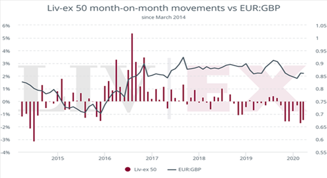 在整個(gè)2017年度,Liv-ex 50(見下文)對(duì)歐元兌英鎊匯率非常敏感;隨歐元的升跌而變化。 在2018年度,價(jià)格因匯率穩(wěn)定也變得相對(duì)平穩(wěn)。在2019年夏季,英鎊由于Theresa May被迫辭職而疲軟,美元和歐元買家再次把握入市。然而,在英國大選前夕及美國對(duì)歐洲葡萄酒征收關(guān)稅等因素的影響下,英鎊快速走強(qiáng),令市場(chǎng)(Liv-ex 50)在最后一個(gè)季度走軟。