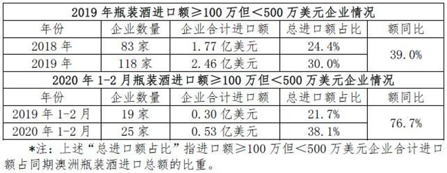 今年1-2月,盡管疫情對行業(yè)有一定沖擊,但澳洲瓶裝酒進口頭部企業(yè)基本穩(wěn)住陣腳。雖然進口額≥1000萬美元的企業(yè)僅1家,少于去年同期,但其進口額同比增長近30%;而進口額≥500萬但小于1000萬美元的企業(yè)有2家,數(shù)量增加,其中,1家進口額實現(xiàn)倍數(shù)增長,1家為新的行業(yè)進入者。