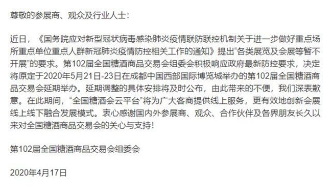 近日,《國(guó)務(wù)院應(yīng)對(duì)新型冠狀病毒感染肺炎疫情聯(lián)防聯(lián)控機(jī)制關(guān)于進(jìn)一步做好重點(diǎn)場(chǎng)所重點(diǎn)單位重點(diǎn)人群新冠肺炎疫情防控相關(guān)工作的通知》提出“各類展覽及會(huì)展等暫不開(kāi)展”的要求。對(duì)此,第102屆全國(guó)糖酒商品交易會(huì)組委會(huì)決定將原定于2020年5月21日-23日在成都中國(guó)西部國(guó)際博覽城舉辦的第102屆全國(guó)糖酒商品交易會(huì)延期舉辦。
