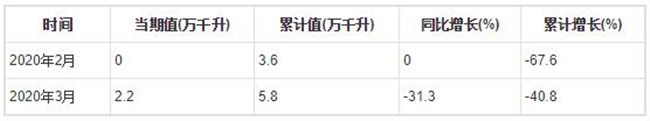 2020年3月全國(guó)葡萄酒產(chǎn)量為2.2萬(wàn)千升,累計(jì)值為5.8萬(wàn)千升,同比下降31.3%,累計(jì)下降40.8%。