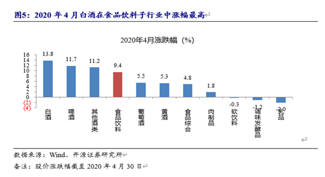 尤其是進入2020年4月份以來,食品飲料板塊上漲9.4%,其中重要原因是:國內(nèi)疫情控制得當,消費回暖,以白酒為代表的可選消費重新獲得市場青睞,漲幅領跑各大品類,為13.8%,而葡萄酒銷售亦有上漲趨勢,為5.5%。