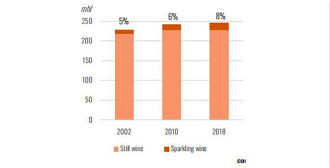 在過去的二十年里,由于全球高需求,起泡葡萄酒市場得以快速擴(kuò)張。2018年,全球起泡葡萄酒的產(chǎn)量首次突破20億升,較2002年增加了57%。