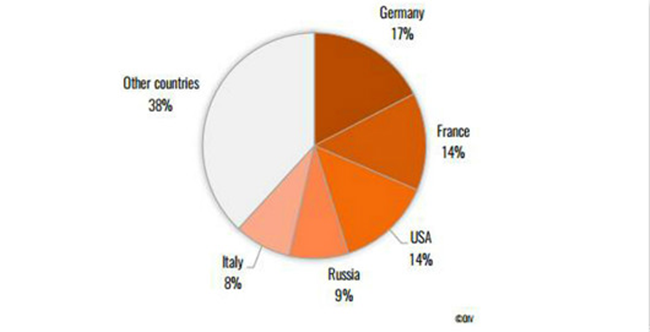 德國位列第三位,2018年的起泡葡萄酒產(chǎn)量2.8億升,略低于平均水平。起泡酒生產(chǎn)占到了總產(chǎn)量的28%,這一比例在所有起泡酒生產(chǎn)國中是最高的。