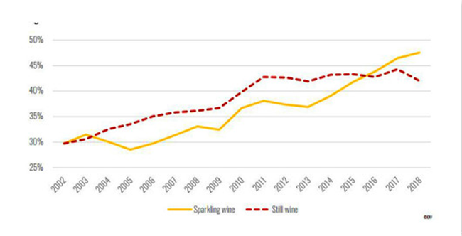 在過去,起泡葡萄酒的國際貿(mào)易少于靜止葡萄酒。但從2016年開始,這一趨勢(shì)發(fā)生了逆轉(zhuǎn)。2018年,起泡葡萄酒所占貿(mào)易份額為48%,而靜止酒為43%。