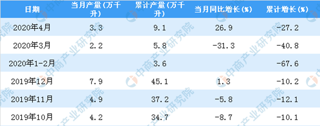 據(jù)中商產(chǎn)業(yè)研究院數(shù)據(jù)庫顯示,2020年4月全國葡萄酒產(chǎn)量為3.3萬千升,同比增長26.9%。2020年1-4月全國葡萄酒產(chǎn)量為9.1萬千升,同比下降27.2%。