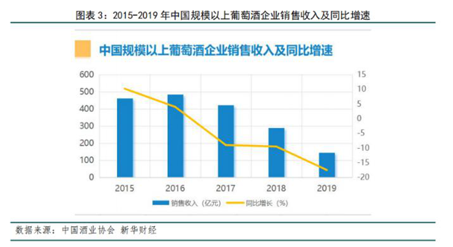 2019年,全國規(guī)模以上葡萄酒企業(yè)數(shù)量155家,銷售收入145.09億元,同比減少17.51%;實(shí)現(xiàn)利潤總額10.58億元,同比降低16.74%。2020年第一季度,銷售收入18.95億元,下降44.02%;利潤0.01億元,下降99.24%。全國葡萄酒行業(yè)規(guī)模以上企業(yè)經(jīng)濟(jì)效益在2019年本就低迷的情況下,受新冠肺炎疫情影響,在2020年第一季度顯得更加慘淡。