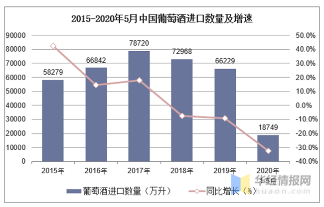 2015-2020年5月中國(guó)葡萄酒進(jìn)口數(shù)量及增速