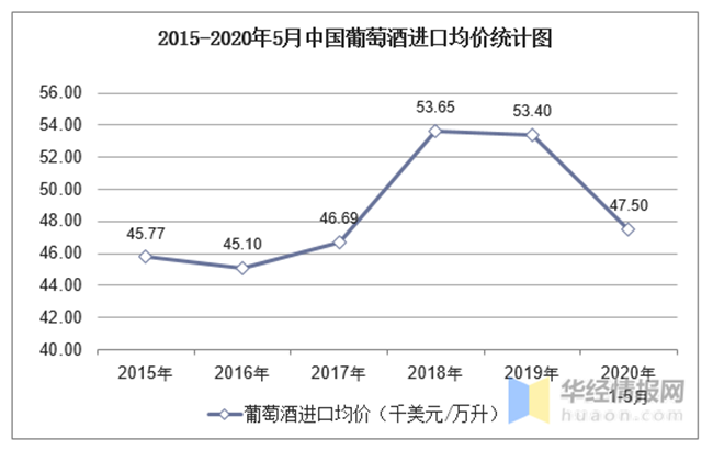 2015-2020年5月中國(guó)葡萄酒進(jìn)口均價(jià)統(tǒng)計(jì)圖