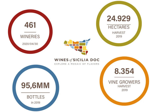 2011年11月22日,西西里法定產(chǎn)區(qū)(SICILIA DOC)由意大利農(nóng)林部正式承認(rèn)通過。2019年,帶SICILIA DOC標(biāo)簽的有460多家酒莊,占約25,000公頃的葡萄園,8354位種植者,超9,500萬瓶的裝瓶量。