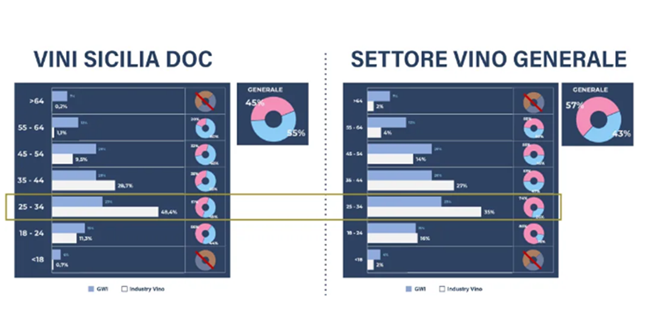 從參與西西里葡萄酒互動(dòng)的用戶畫像上看,西西里法定產(chǎn)區(qū)葡萄酒的消費(fèi)者要年輕很多,區(qū)間甚至低于整個(gè)葡萄酒消費(fèi)的平均年齡段:25-34歲的人群非常集中??傮w來說,消費(fèi)者偏 "男性化",但在18-34歲的年輕群體中,女性消費(fèi)者則更為突出。