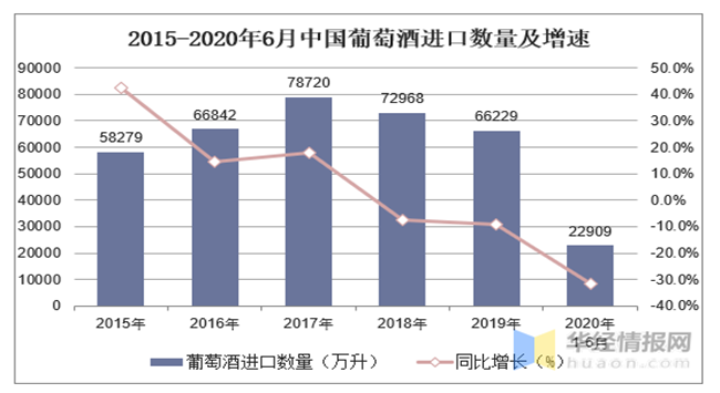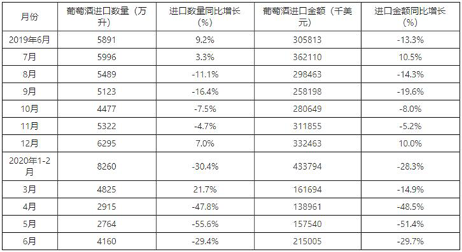 2015-2020年6月中國葡萄酒進(jìn)口數(shù)量及增速
