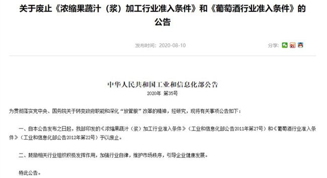 8月10日,中華人民共和國工業(yè)和信息化部發(fā)布公告,稱即日起廢除《濃縮果蔬汁(漿)加工行業(yè)準入條件》(工業(yè)和信息化部公告2011年第27號)和《葡萄酒行業(yè)準入條件》(工業(yè)和信息化部公告2012年第22號)。此外,鼓勵相關(guān)行業(yè)組織積極發(fā)揮作用,加強行業(yè)自律,維護市場秩序,引導(dǎo)企業(yè)健康發(fā)展。