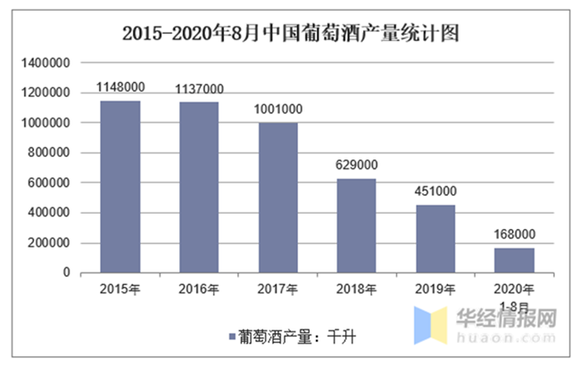 華經(jīng)產(chǎn)業(yè)研究院數(shù)據(jù)顯示:2020年8月中國(guó)葡萄酒產(chǎn)量為21000千升,同比下降22.2%;2020年1-8月中國(guó)葡萄酒產(chǎn)量為168000千升,同比下降28.8%。