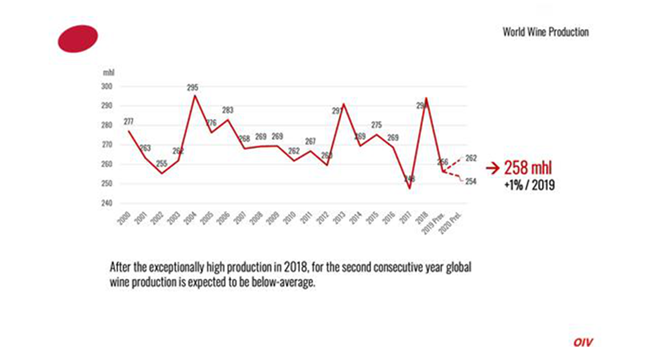 在經歷了2018年異常高的產量后,預計全球葡萄酒產量將連續(xù)第二年低于平均水平。